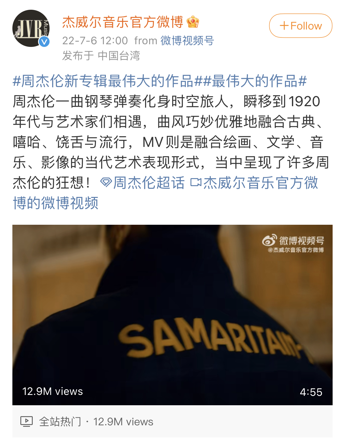 【文/觀察者網 嚴珊珊】今天(7月6日)中午12時,超700萬人預約、“鴿”了6年的周杰倫第15張專輯《最偉大的作品》釋出同名先行曲MV。
