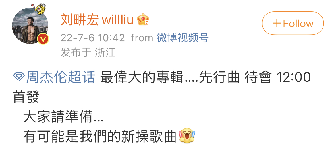 周杰倫好友劉畊宏也跑來湊熱鬧:新健身操的背景樂有了。