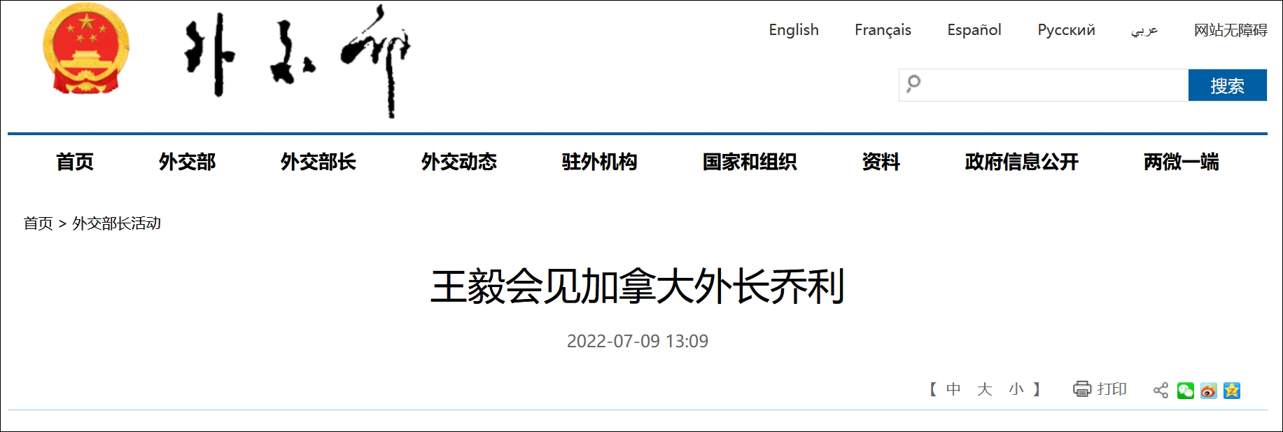 據外交部網站消息,當地時間2022年7月8日,國務委員兼外長王毅在巴厘島出席二十國集團外長會期間應約會見加拿大外長喬利。