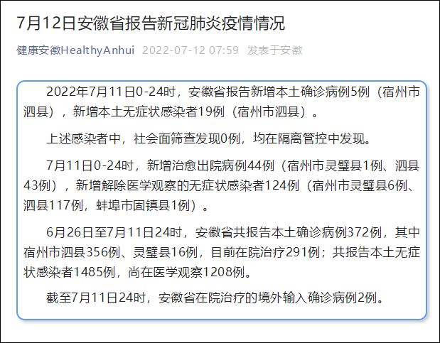 6月26日至7月11日24時,安徽省共報告本土確診病例372例,其中宿州市泗縣356例、靈璧縣16例,目前在院治療291例;共報告本土無症狀感染者1485例,尚在醫學觀察1208例。
