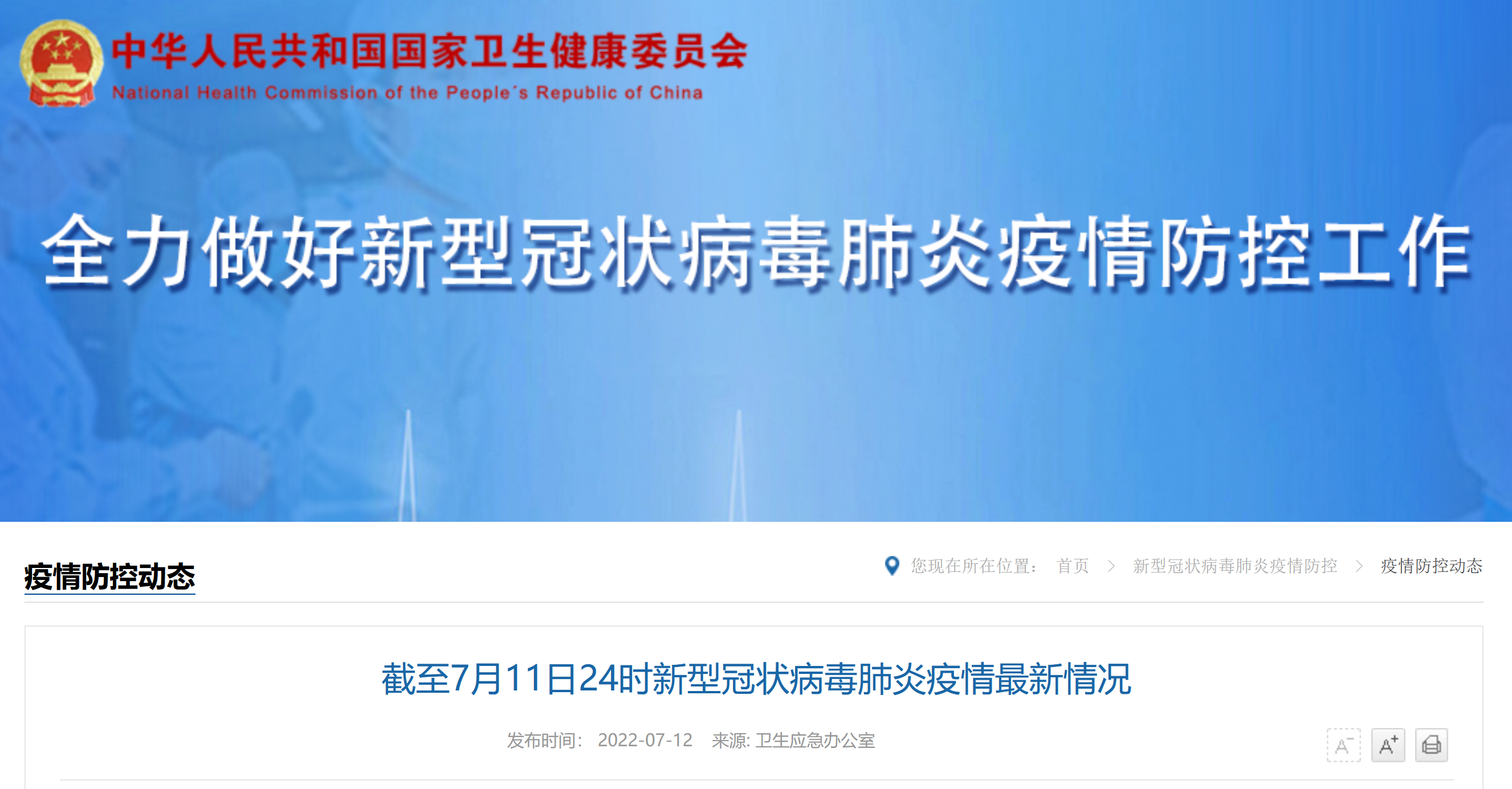 據國家衞健委網站網站消息,7月11日0—24時,31個省(自治區、直轄市)和新疆生產建設兵團報告新增確診病例107例。其中境外輸入病例38例(廣東11例,上海8例,福建6例,天津4例,江西2例,雲南2例,陝西2例,山東1例,重慶1例,四川1例),含2例由無症狀感染者轉為確診病例(天津1例,廣東1例);本土病例69例(廣東22例,河南9例,海南9例,山東8例,上海5例,江蘇5例,安徽5例,內蒙古2例,浙江2例,四川1例,陝西1例),含10例由無症狀感染者轉為確診病例(山東6例,廣東2例,浙江1例,四川1例)。無新增死亡病例。無新增疑似病例。
