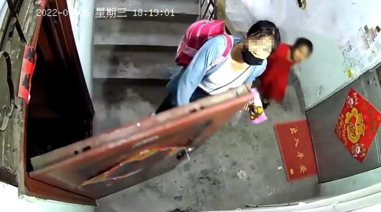 據九派新聞7月12日消息,視頻顯示,7月6日傍晚6點19分,一對母女沿着樓梯上樓,母親在前,女孩在後。到達門口後,該女子拿鑰匙開門。