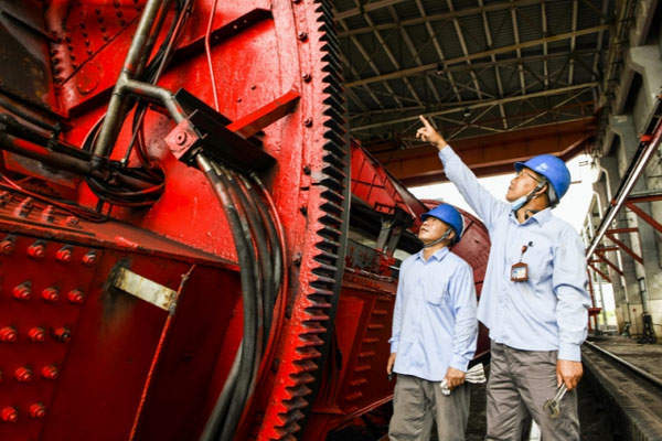 浙能蘭溪發電公司職工正在煤炭翻車機房檢查設備。