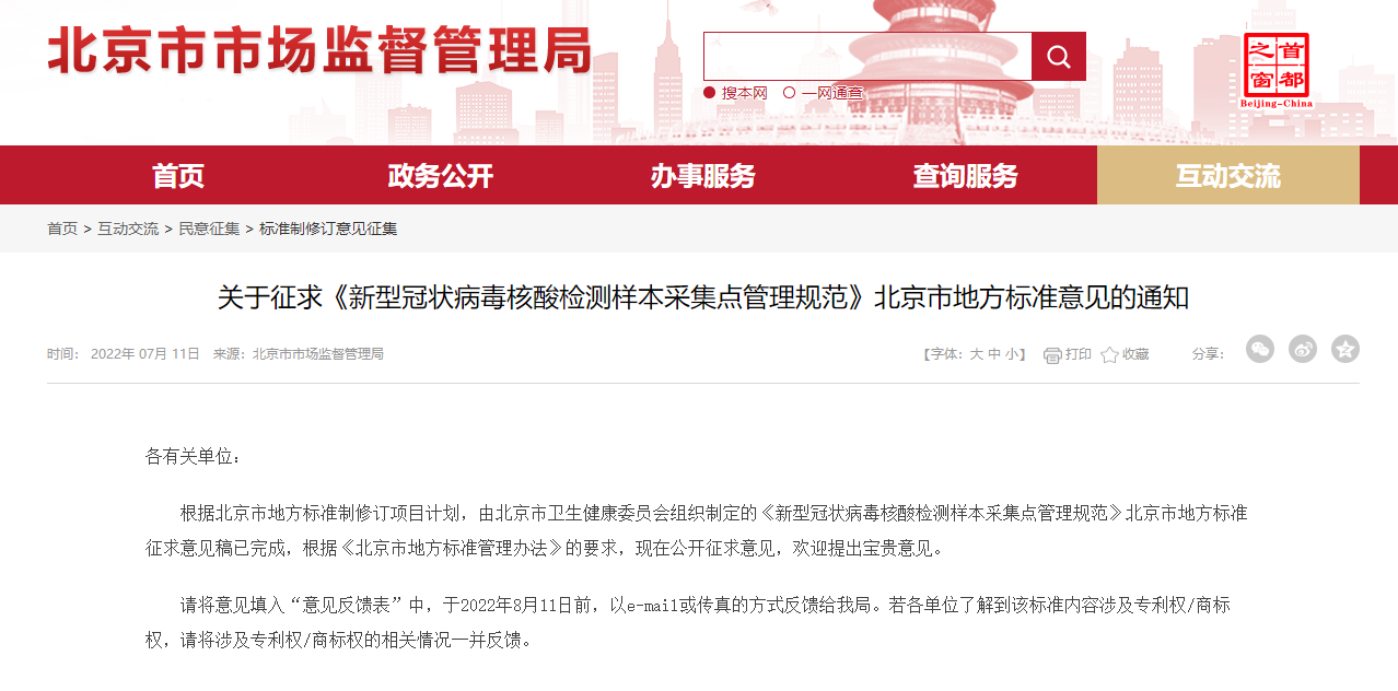 北京市市場監督管理局網站7月11日發佈通知,就《新型冠狀病毒核酸檢測樣本採集點管理規範》北京市地方標準徵求意見,反饋截止日期為2022年8月11日。