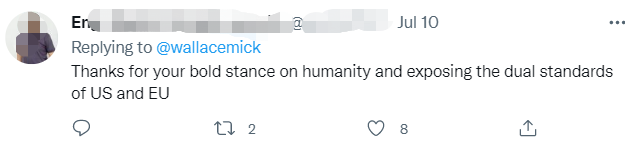 “謝謝你在人道問題上勇敢的立場,謝謝你揭露美國和歐盟的雙標。”