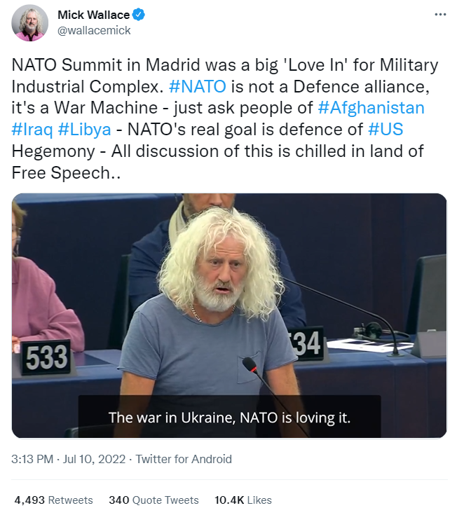7月10-11日,一向敢於直言的歐洲議會愛爾蘭籍議員米克 · 華萊士(Mick Wallace)在推特發佈視頻,顯示其在近日召開的一次歐洲議會全體會議上直斥“北約熱衷於烏克蘭戰爭”。
