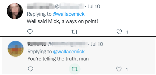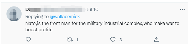 7月10-11日,米克·華萊士在推特發佈了兩條內容一樣的視頻,記錄了其4日在歐洲議會全體會議上發言的片段。視頻中,他稱北約馬德里峯會揭示了該組織是軍工聯合體支持者的“友愛大聚會”(a big ‘Love-in’),“北約不是個防禦聯盟,而是台戰爭機器,問問阿富汗、伊拉克和利比亞的人民就知道了”。