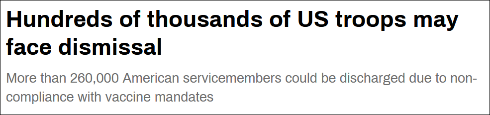 根據這項數據,美國陸軍、海軍、空軍及海軍陸戰隊共有268858名士兵接種了疫苗,但沒有完成全程接種。需要注意的是,這些數字並不包括尚未接種疫苗的人員,這意味着實際上面臨解僱風險的美軍人數可能還會更高。