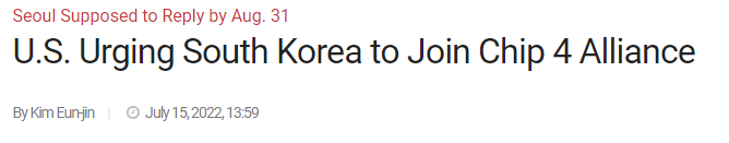 美國最初於今年3月提出與韓國、中國台灣、日本組成芯片四方聯盟的構想,以加強芯片產業合作,抗衡中國大陸,相關工作會議將在8月份舉行。韓聯社援引美國政府消息人士的話稱,美政府已要求韓國在8月31日之前答覆美方是否會加入四方聯盟。