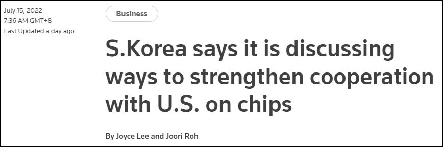 據路透社報道,韓國總統辦公室週四(14日)就如何加強芯片生產合作與美方進行討論,“美方在去年6月的供應鏈審查報告中,多次強調芯片領域合作的重要性。”
