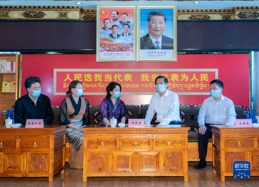 7月12日至15日,中共中央政治局常委、全國人大常委會委員長慄戰書在西藏就青藏高原生態保護立法進行調研。這是7月15日,慄戰書在拉薩城關區功德林街道,調研基層人大工作情況。新華社記者翟健嵐攝