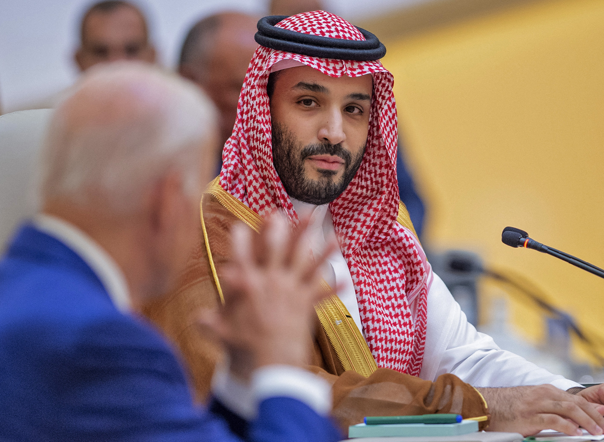 7月16日,在“海灣合作委員會+3”峯會上,沙特王儲(右)穆罕默德看向拜登 圖源:視覺中國