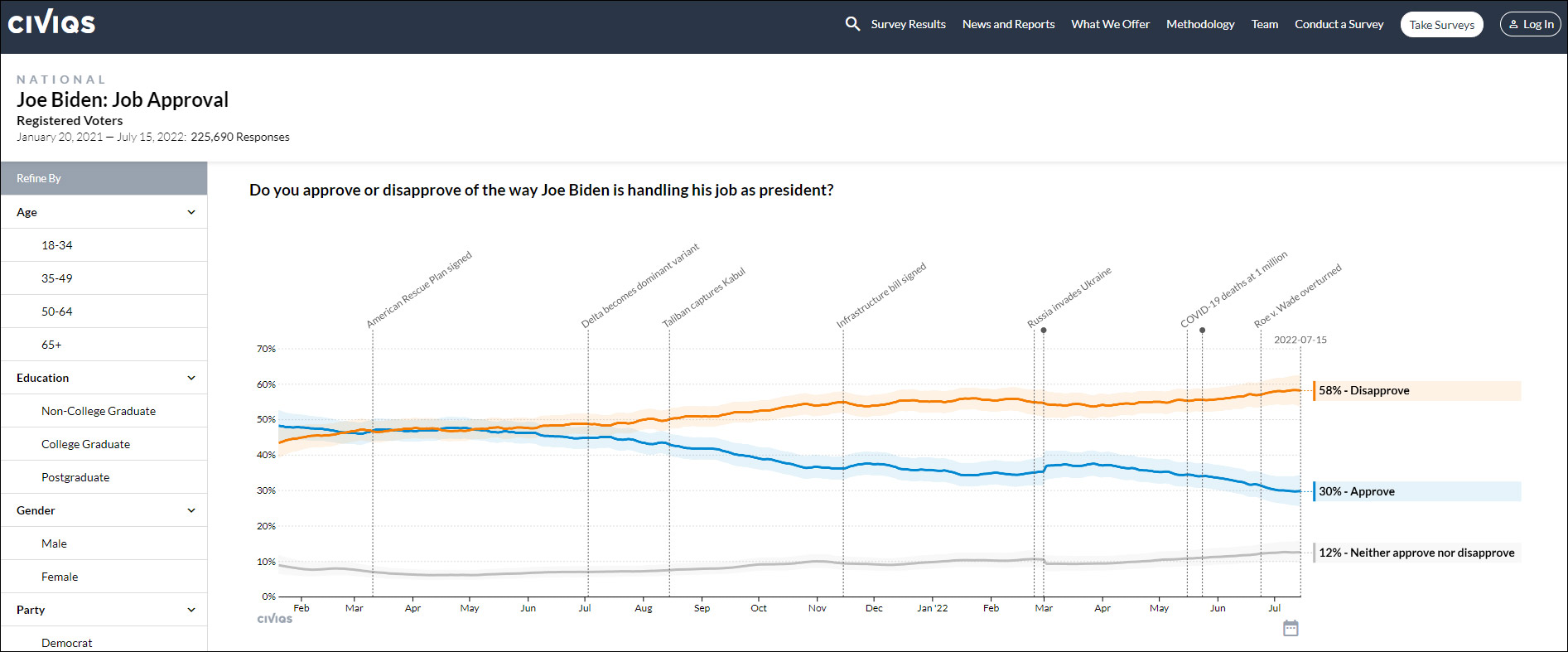 截至當地時間15日,拜登在民調機構Civiqs的支持率僅有30%。而特朗普執政期間,該網站記錄的他的最低支持率也有39%。