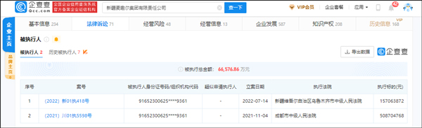 企查查顯示,新疆麥趣爾集團有限責任公司1993年7月30日成立,註冊資本為33999萬元人民幣,法定代表人為李玉瑚。目前,新疆麥趣爾集團有限責任公司被執行總金額約6.66億,存在超過100起歷史被執行信息。其中發生於今年內此前的被執行案已有4起,分別為(2022)新2301執160號、(2022)新2301執985號、(2022)新2301執3186號、(2022)新2301執3215號,執行法院均為昌吉市人民法院。