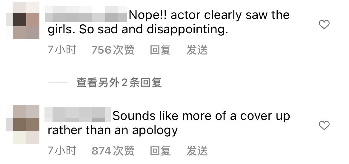 “看了很多遍,演員很明顯看到了兩名小女孩,然後忽視了她們,這個回應真令人失望”“不像道歉,更像是想掩蓋事實”。