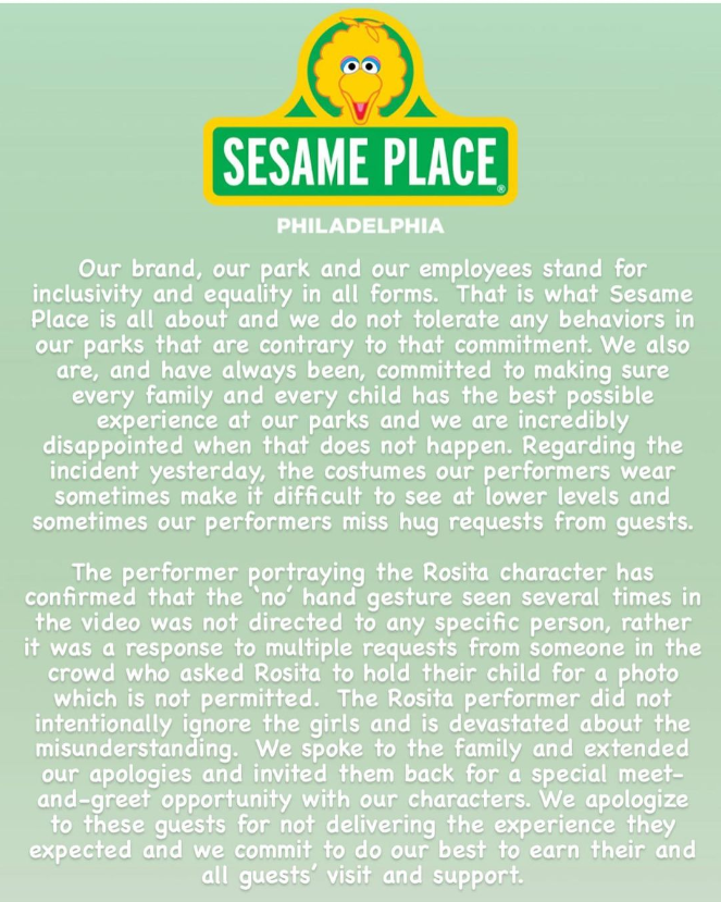 當地時間18日,芝麻街發佈情況説明,稱演員穿着布偶套裝,有時候很難看到下方,所以會錯過遊客的擁抱請求,園區與羅西塔的扮演者進行了交談,對方表示,自己的擺手並不針對任何人,只是有太多人喊話要合照,但這是不允許的,所以才擺了手,並非刻意忽視小女孩,演員稱,自己對於這些誤解很震驚。聲明表示,已經給兩名小女孩道歉。