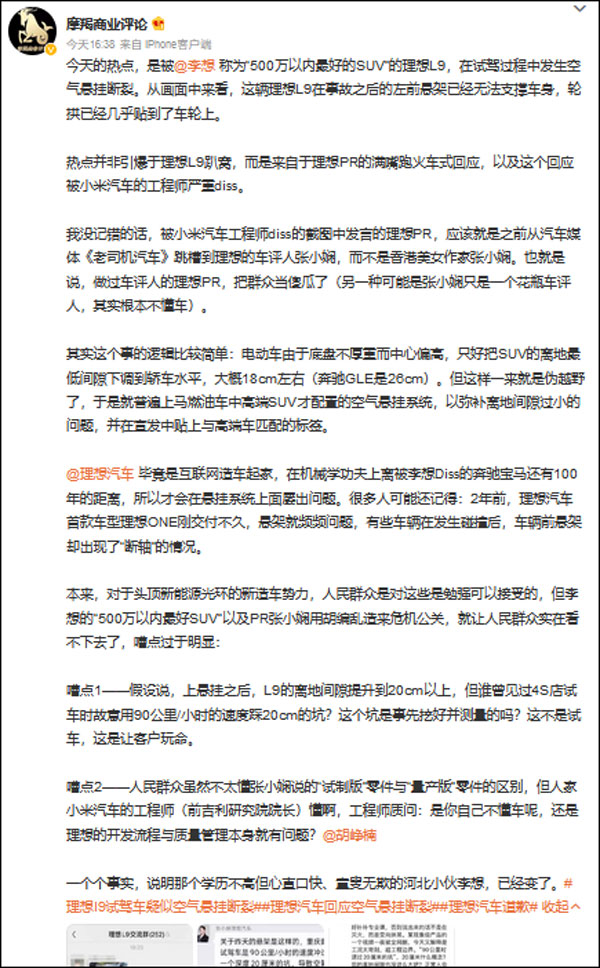 據網傳截圖,原吉利汽車研究院院長、現加盟了小米汽車的胡錚楠在微信朋友圈嘲諷理想汽車的公關要惡補專業知識,質疑“以90公里時速通過20釐米的坑”的説法太不符合實際,並稱“如果真是這個情況,輪胎沒爆只幹爆了空氣懸掛,只能説您家的輪胎真棒”。