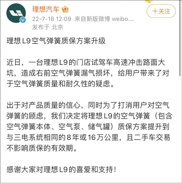 出於對產品質量的信心,同時為了打消用户對空氣彈簧的顧慮,我們決定將理想L9的空氣彈簧(包含空氣彈簧本體、空氣泵、儲氣罐)質保方案提升到與三電系統相同的8年或16萬公里,且二手車交易不影響質保的有效期。感謝大家對理想L9的喜愛和支持!”