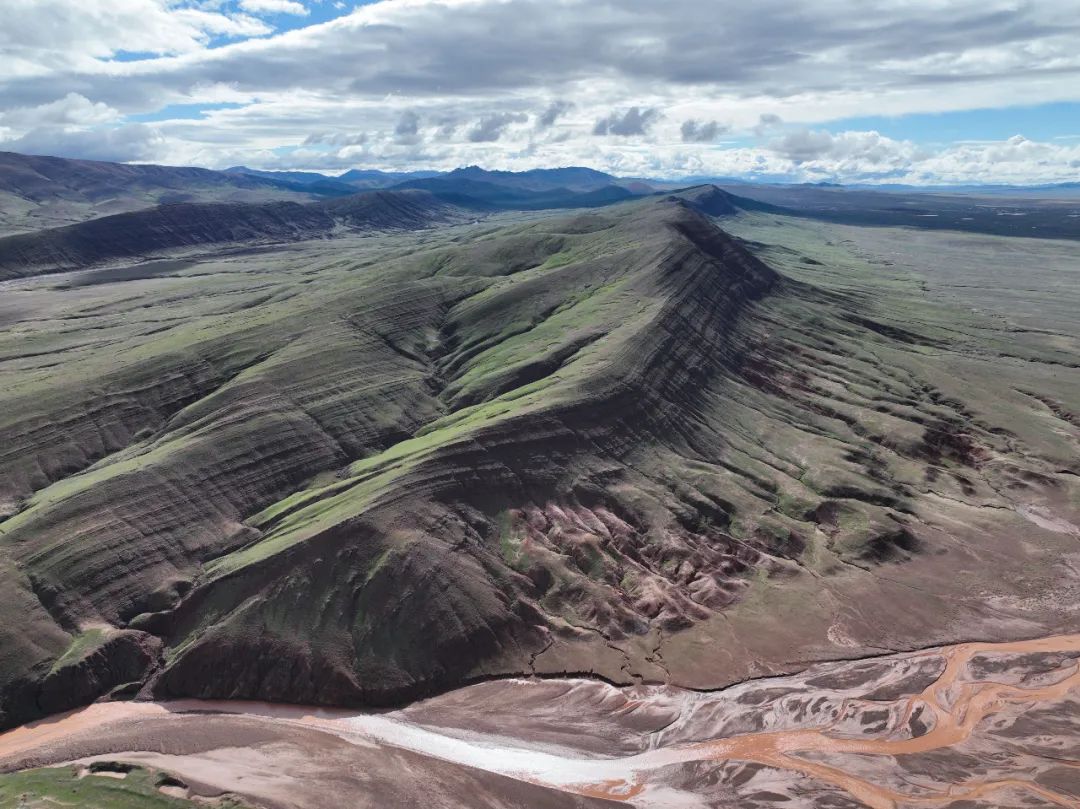 此處“紅山脈”位於可可西里盆地中部。記者跟隨科考隊在現場看到,紅褐色山體在可可西里夏季的綠色草原中十分顯眼,山體上地層清晰,呈現出層疊狀態。