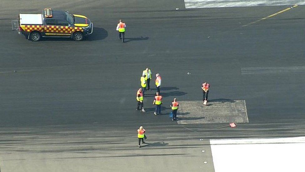 航拍畫面顯示,盧頓機場工作人員正在檢查地面上的一個大矩形區域