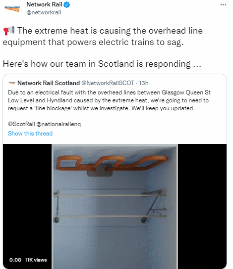 而受影響的不止鐵軌,英國為電車提供動力的架空線路也出現彎曲下垂情況。
