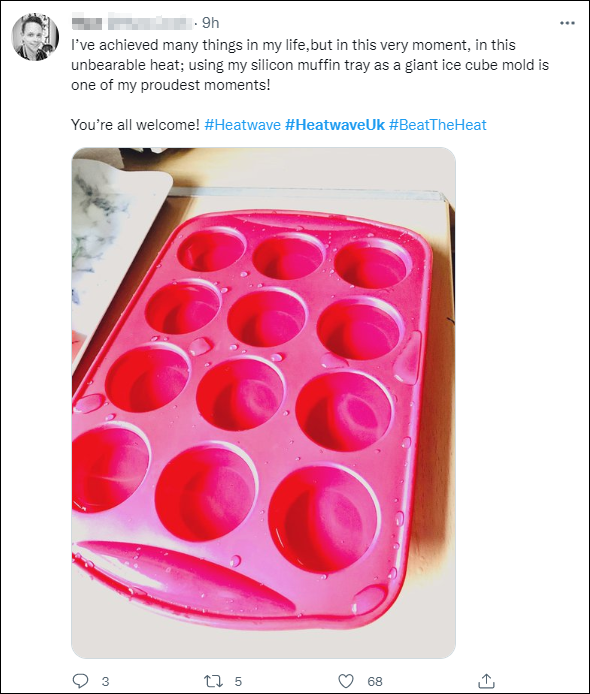 對此,一位坐擁了多顆冰塊的英國民眾不禁為自己的靈活變通而自豪:“我這輩子取得了很多成就,但就在這一刻,在這難以忍受的炎熱中,把我的硅膠鬆餅盤當成一個巨大的冰格來用,就是我最自豪的時刻之一!”