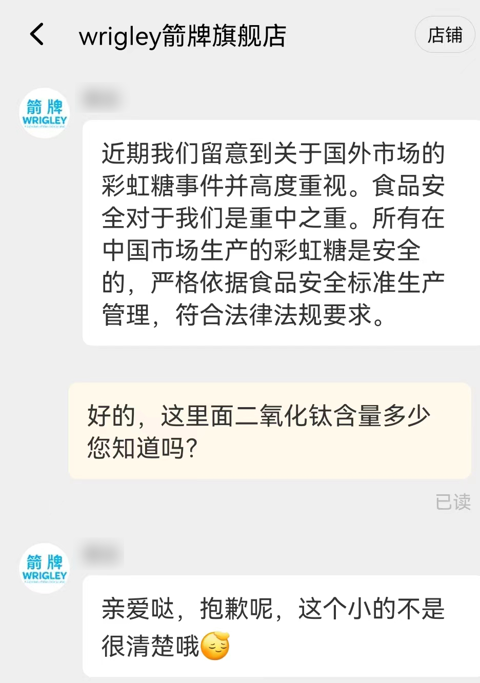 當觀察者網以消費者身份詢問“瑪氏在美國因彩虹糖中含有二氧化鈦被訴”一事,旗艦店客服回應稱,近期我們留意到關於國外市場的彩虹糖事件並高度重視。食品安全對於我們是重中之重。所有在中國市場生產的彩虹糖是安全的,嚴格依據食品安全標準生產管理,符合法律法規要求。