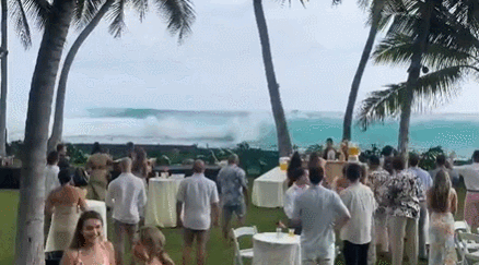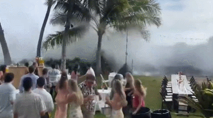 直到巨浪逼近海堤,一些人開始後退。幾秒鐘後,撞擊到海堤的巨浪越出,吞沒了用花卉裝飾的桌子,並帶着桌椅砸向賓客。根據視頻,賓客們爭先恐後地尋找庇護,一些人驚呼了起來,還有人難以置信地反覆念着髒話。