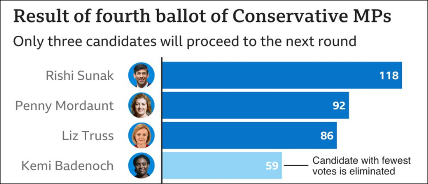 當地時間7月19日,經英國保守黨議員新一輪投票,進入第五輪投票的保守黨黨首候選人名單出爐,分別是前財政大臣蘇納克(118票)、前國防大臣莫當特(92票)和外交大臣特拉斯(86票)。