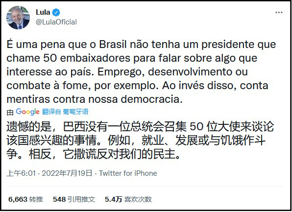 博索納羅在2018年以55%得票率當選總統,但自當選以來就一直稱選舉存在舞弊。在民調落後前總統盧拉10%,10月大選連任敗選可能性增加的情況下,他加碼攻擊選舉系統,18日更是向世界多國代表稱2018年大選間黑客可隨意登錄巴西最高選舉法院(TSE)系統,TSE事後拒絕配合,最高法院也阻撓政府調查和採取糾正措施,導致2022大選仍然可能發生舞弊。