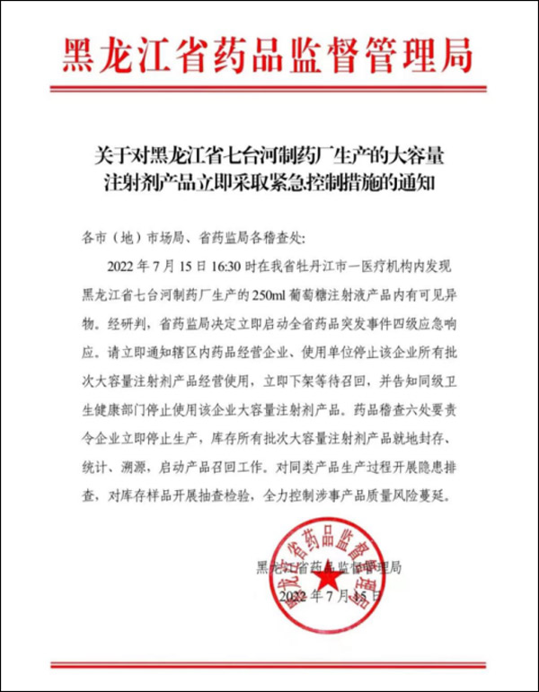 7月15日,黑龍江省藥品監督管理局發佈“關於對黑龍江省七台河製藥廠生產的大容量注射劑立即採取緊急控制措施的通知”,通知顯示黑龍江省七台河製藥廠生產的250毫升葡萄糖注射液產品在醫療機構臨牀使用時發現有可見異物。健康時報發現,今年4月,該廠的葡萄糖注射液剛中標地方輸液集中帶量採購。