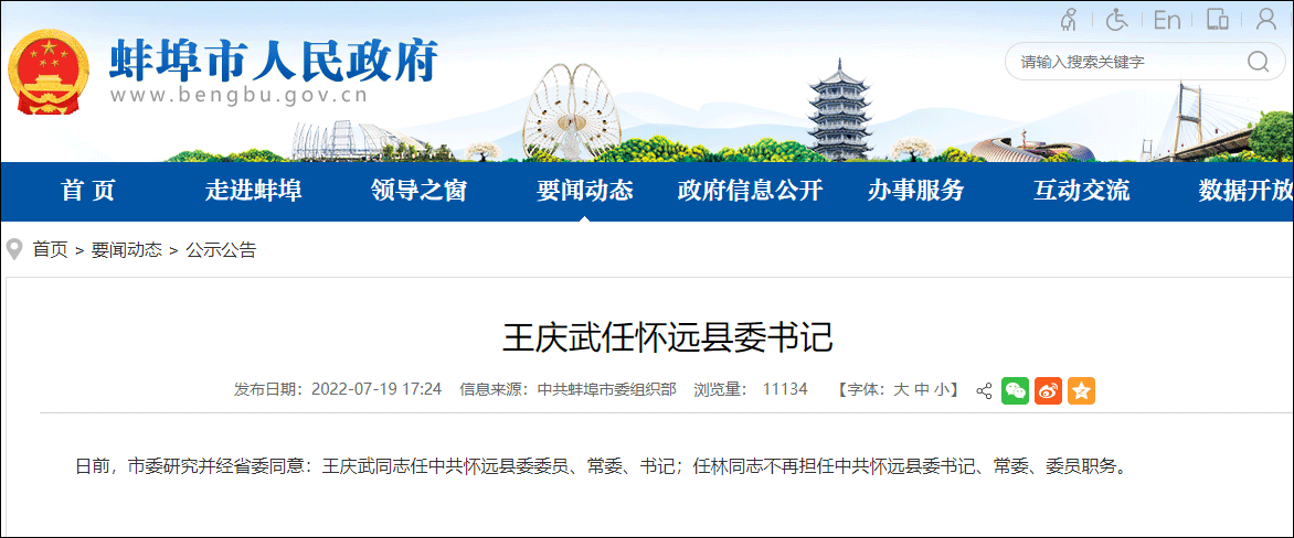 據安徽蚌埠市政府官網7月19日消息,日前,市委研究並經省委同意:王慶武同志任中共懷遠縣委委員、常委、書記;任林同志不再擔任中共懷遠縣委書記、常委、委員職務。