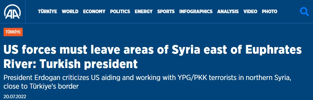 埃爾多安稱,美國在幼發拉底河以東已連續幾年向當地的“恐怖組織”輸送數千輛卡車的武器、彈藥和裝備,而美軍在為其成員提供培訓。他列舉了庫爾德武裝組織“庫爾德工人黨”(PKK)和“人民保護部隊”(YPG)為他所指的恐怖組織。