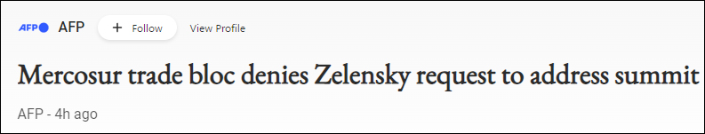 巴拉圭:南方共同市場峯會拒絕了烏克蘭總統澤連斯基的發言請求