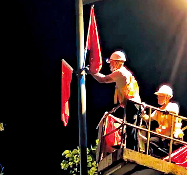 逾百名市民去年發起掛國旗行動,連續數天晚上10時至翌日凌晨3時在公路燈柱掛國旗,圖自香港《大公報》
