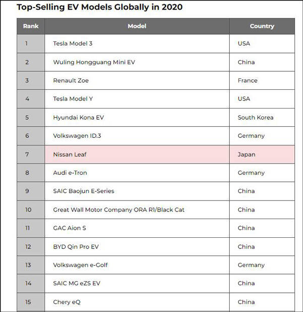 隨着全球電動汽車市場繼續快速增長,日本車企的相對排名也正在下降。日產聆風是唯一進入2020年電動汽車銷售前十名的日本製造的汽車,但這款車也從2019年的第3名下滑到第7名。與此形成對比的是,中國車輛品牌在前15名中佔據7席。