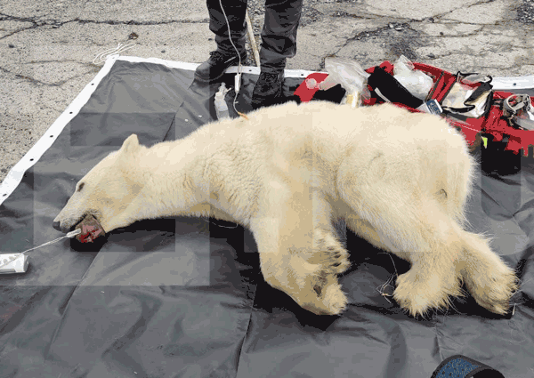 參與救援的獸醫阿爾希納斯基説,當時他們在距離迪克森機場3公里的地方發現了這隻大約2歲的雌性北極熊。獸醫小組順利向它發射麻醉針後,這隻熊在10分鐘內就睡着了。