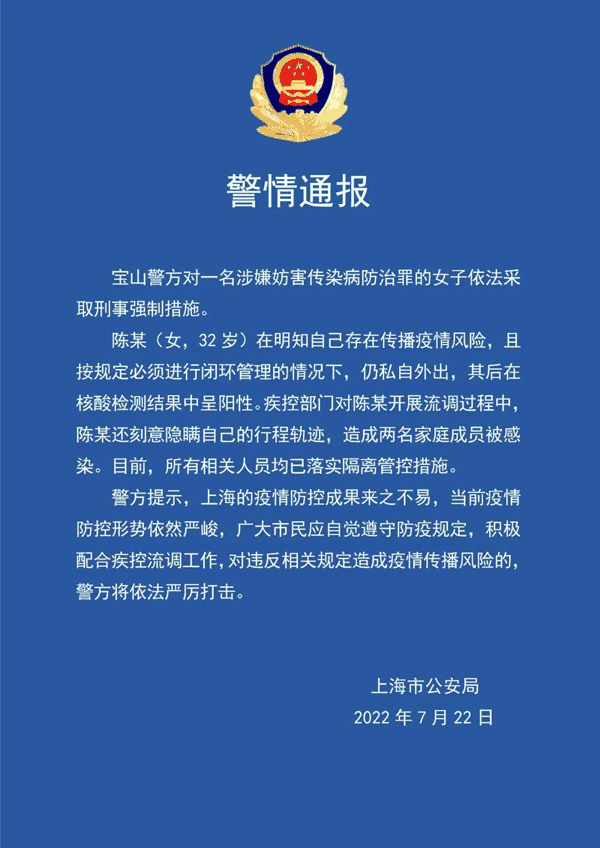 據“上海發佈”微信公眾號22日消息,寶山警方對一名涉嫌妨害傳染病防治罪的人員依法採取刑事強制措施。
