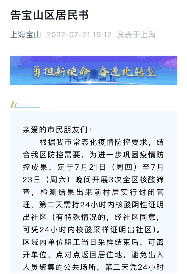 昨日(21日),微信公眾號“寶山發佈”發佈消息,根據我市常態化疫情防控要求,結合我區防控需要,為進一步鞏固疫情防控成果,定於7月21日(週四)至7月23日(週六)晚間開展3次全區核酸篩查,檢測結果出來前村居實行封閉管理,第二天需持24小時內核酸陰性證明出社區(有特殊情況的,經社區同意,可憑24小時內核酸採樣證明出社區)。