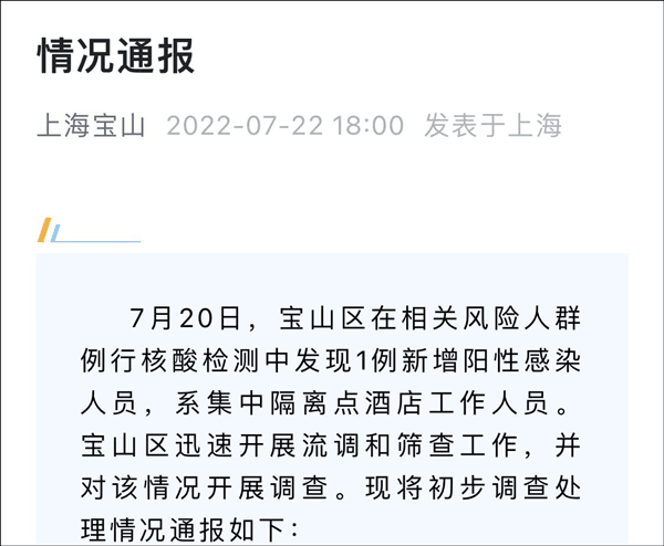 今日稍早,據“上海寶山”微信公眾號7月22日消息,7月20日,寶山區在相關風險人羣例行核酸檢測中發現1例新增陽性感染人員,系集中隔離點酒店工作人員。寶山區迅速開展流調和篩查工作,並對該情況開展調查。現將初步調查處理情況通報如下: