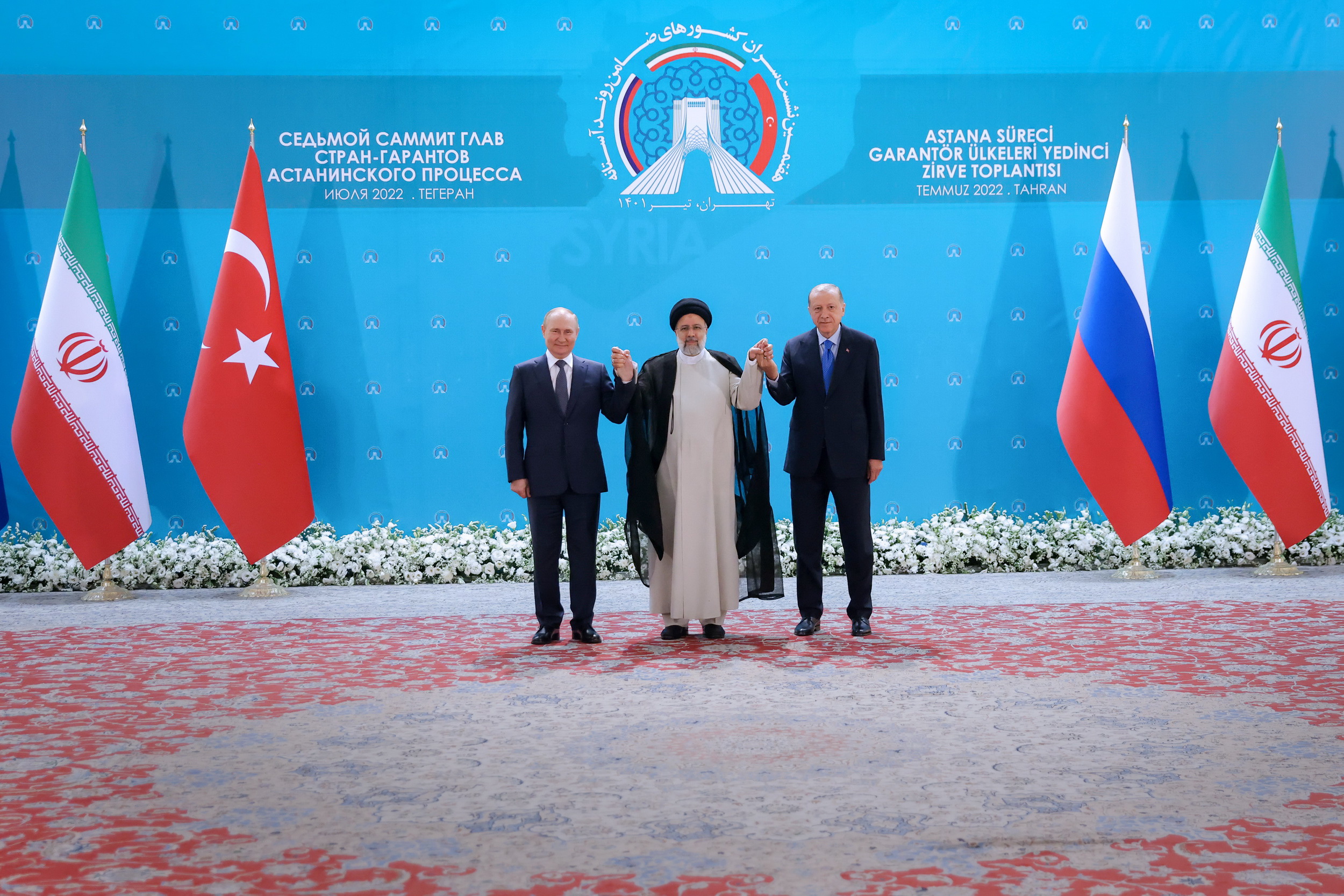 7月19日,伊朗德黑蘭,俄羅斯總統普京、伊朗總統萊希、土耳其總統埃爾多安三人合影。圖自澎湃影像