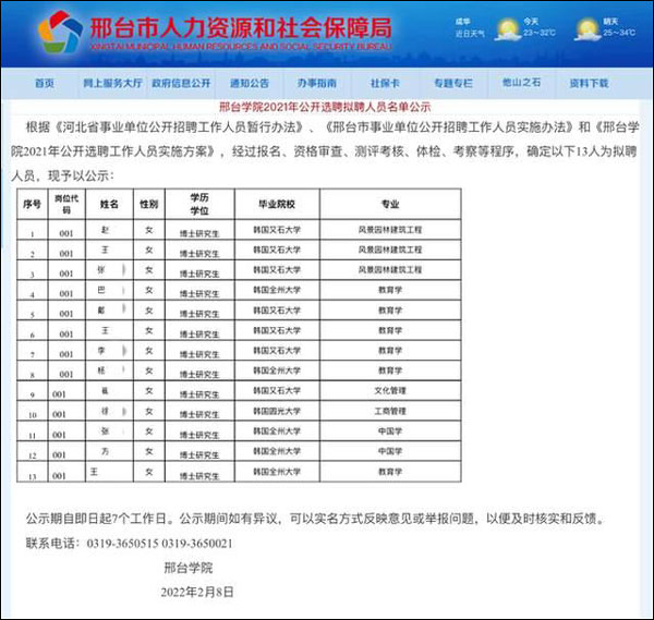 無獨有偶,繼邵陽學院之後,邢台學院也被曝出疑似存在批量引進“速成博士”的情況。據瞭解,今年2月邢台學院公佈了一份2021年公開選聘擬聘人員名單,共13人,均為韓國高校博士,有網友根據名單發現,這批博士此前或為邢台學院在職教師。