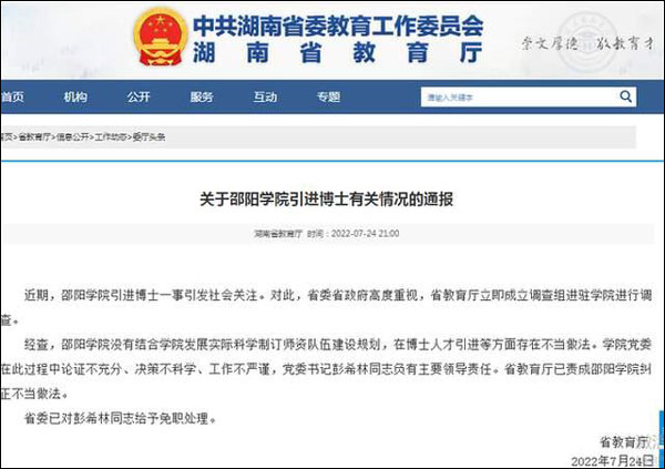 據“新黃河客户端”今日(25日)報道,日前,邵陽學院斥巨資引進菲律賓博士一事在網絡上引起軒然大波,7月24日晚,湖南省教育廳針對此事發出通告,已責成邵陽學院糾正不當做法,並對相關責任人給予免職處理。