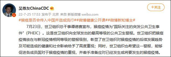 7月25日,就猴痘是否會傳入中國並造成流行一事,中國疾控中心流行病學首席專家吳尊友發文解讀。