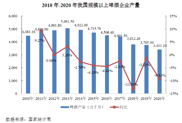早在2002年,我國啤酒產量達到2386.8萬千升,超過美國成為世界第一,但在2013年我國啤酒產量達到歷史高點5061.5萬千升後,我國人均啤酒消費量開始緩慢下降,啤酒產量也隨之下降至2020年的3411.1萬千升。