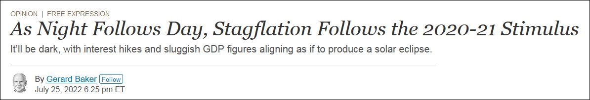 《華爾街日報》編輯貝克則更為直接,他直接在25日點出,拜登政府2020年至2021年的經濟刺激後,美國經濟將陷入“滯脹”。