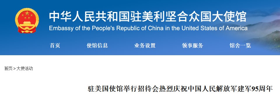 據中國駐美國大使館網站7月27日消息,2022年7月26日晚,中國駐美國使館舉行招待會,熱烈慶祝中國人民解放軍建軍95週年。秦剛大使發表主旨講話,徐學淵公使、井泉公使、即將離任的國防武官張力少將、剛剛到任的國防武官劉展少將等參加,美軍方、國務院官員和各界友好人士,各國駐美使團、武官團以及部分華人華僑代表約300人出席。