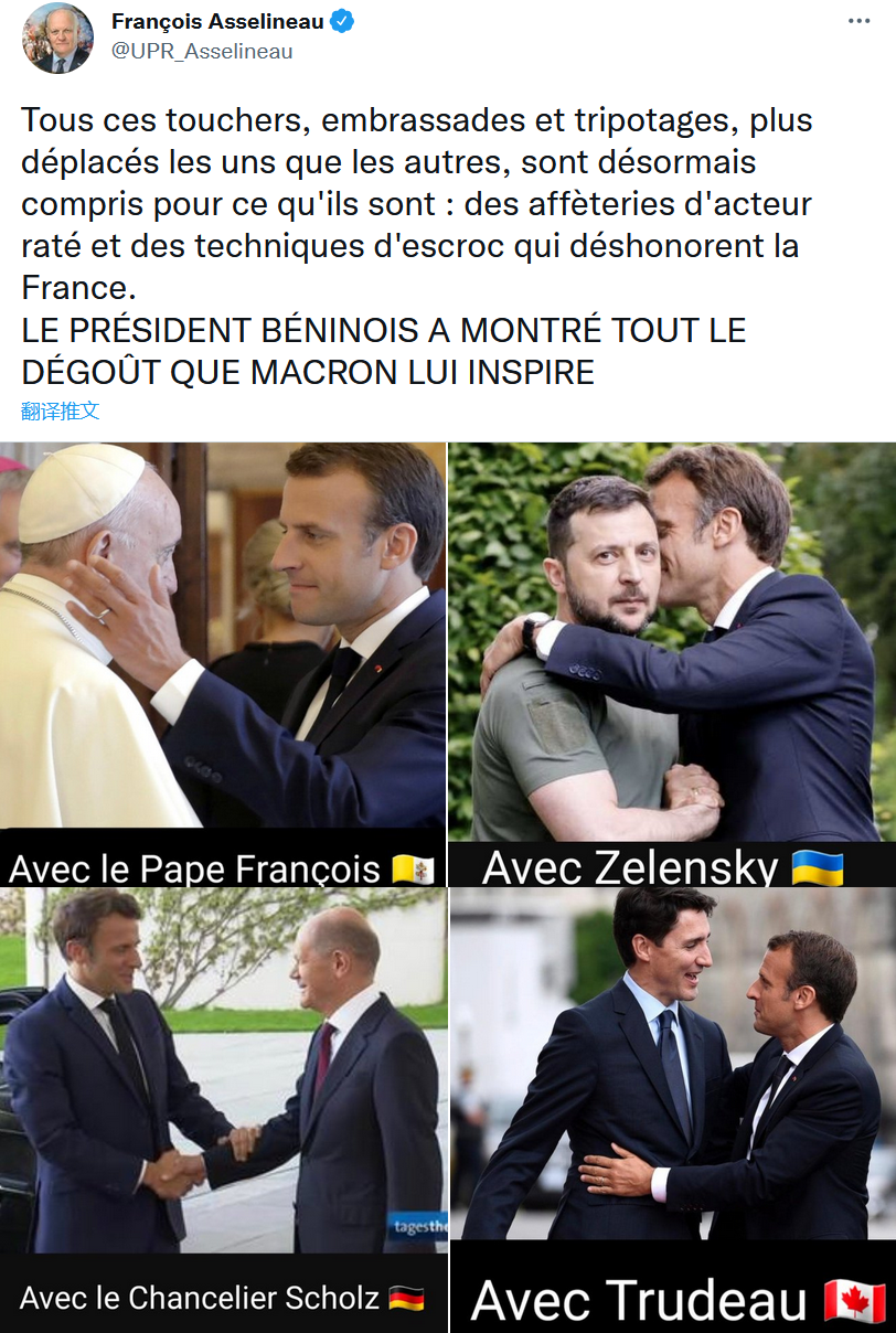 弗朗索瓦還特地發了一張馬克龍與其他領導人“親密接觸”的照片合集,抨擊他在外交中習慣性做出“不合時宜”、“裝腔作勢”的舉動,這才招來了對方的“羞辱”,“所有這些觸摸、擁抱和擺弄,一個比一個更不合時宜。失敗者的裝腔作勢和欺騙手段使法國蒙羞。”