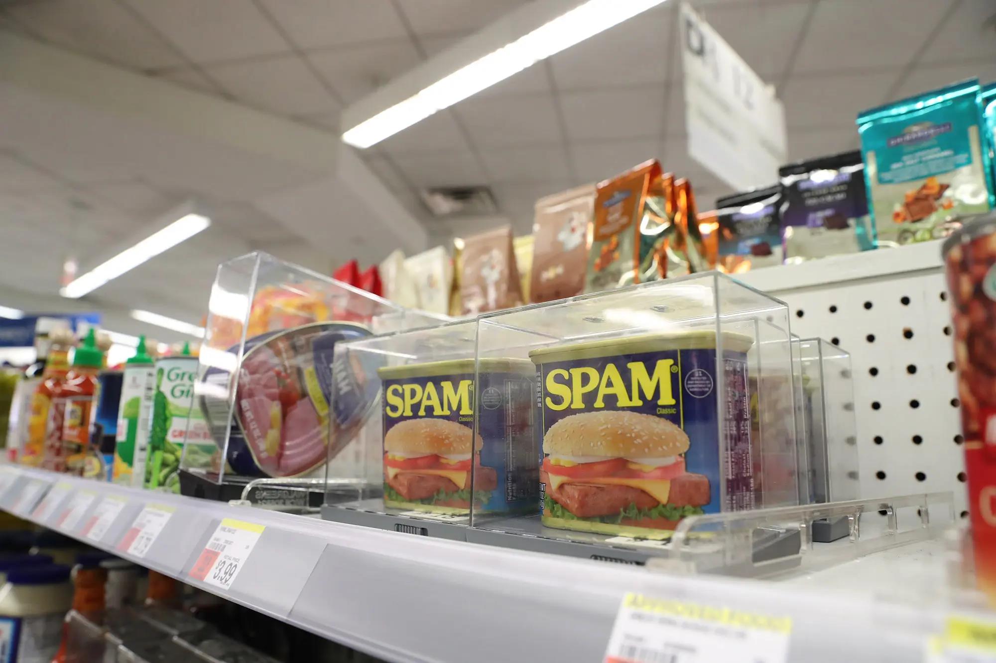 據報道,在紐約港務局巴士車站的連鎖商店杜安裏德(Duane Reade),每罐售價3.99美元(約合人民幣26.9元)的斯帕姆午餐肉(SPAM)、每罐僅售1.89美元(約合人民幣12.7元)的StarKist金槍魚罐頭,以及其他罐頭食品如今正被裝在塑料防盜盒裏鎖上。