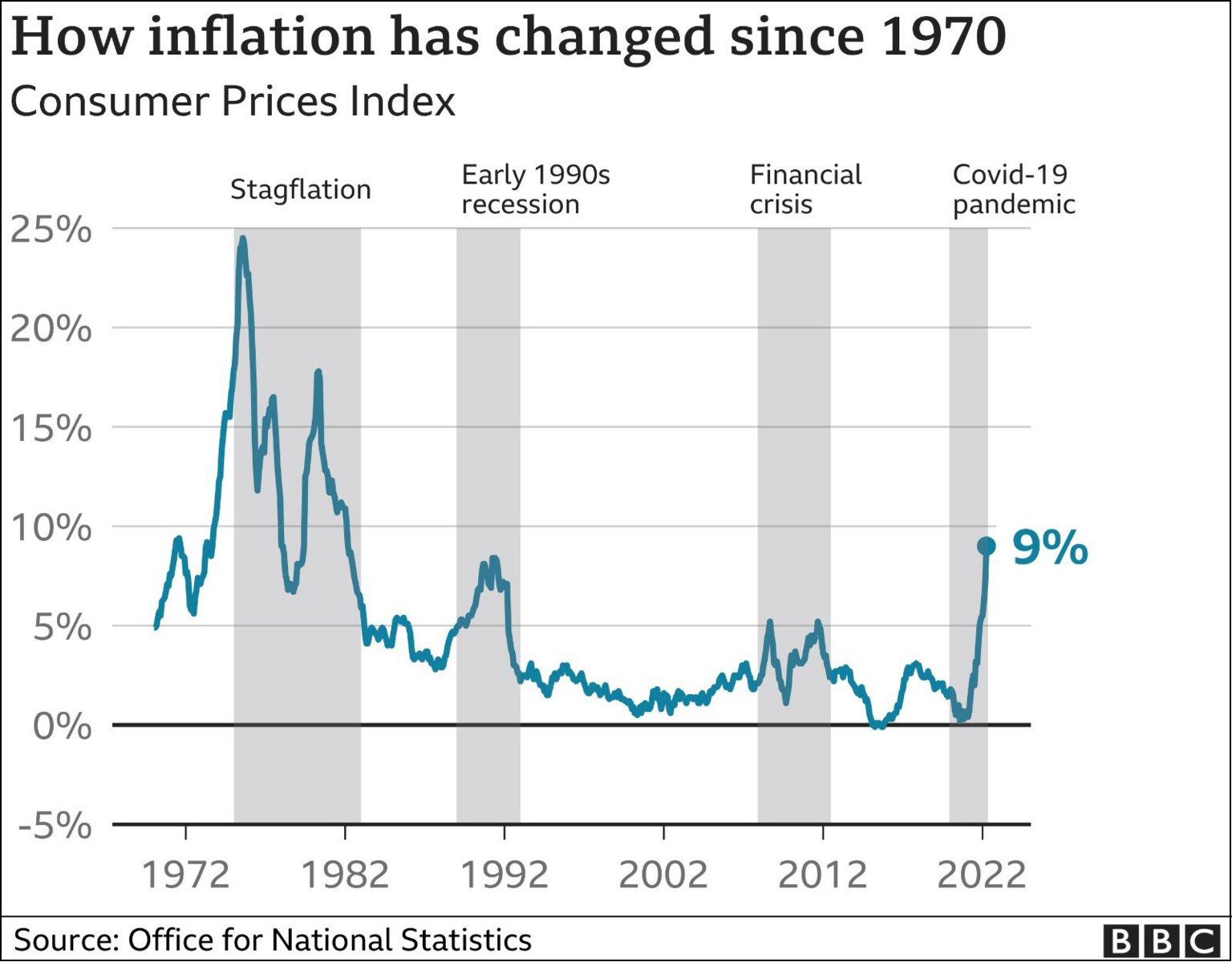目前,英國的通脹率已經達到9.4%。不過,這並不是英國歷史上通脹最為嚴重的時候。在70年代的石油危機,英國通脹率一度超過20%,同時伴隨着經濟衰退,是經濟學家最擔心的“停滯性通脹”現象。